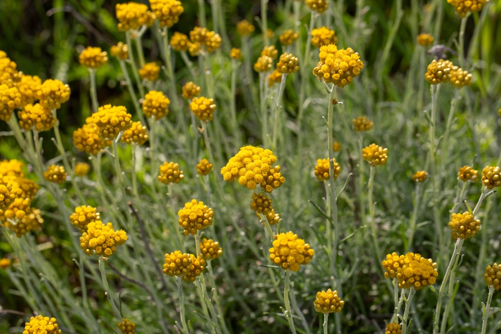 Chrysocephalum Desert Flame is a hardy Australian native groundcover. It bares Golden yellow flowers and on top of underlaying silver foliage.