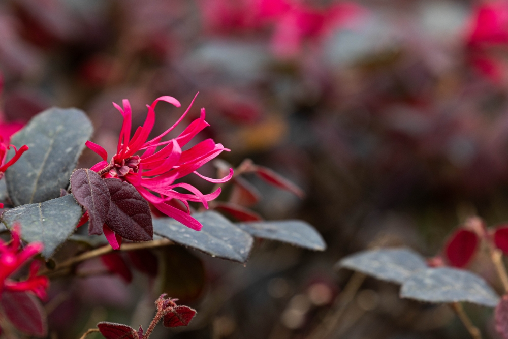 A compact evergreen shrub with deep burgundy to purple foliage year-round. Hot pink to magenta, spidery, strap-like flowers appear in spring, creating a vivid contrast against the dark leaves. Stays compact — grows to around 1m.