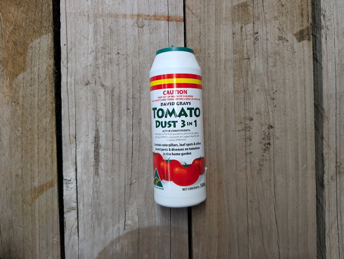 Tomato Dust 3 in 1, controls caterpillars, leaf spot and other insect pects and diseases on Tomatoes in the home garden